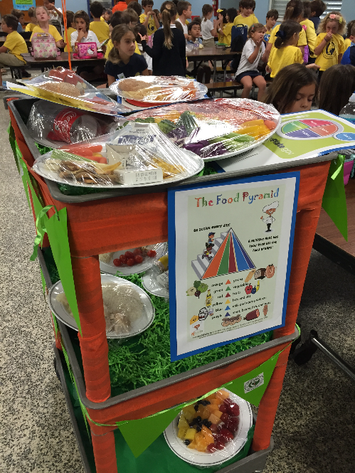 Parent volunteers decorated a rolling cart to resemble a garden and stacked it with plates of “happy” and “sad” food.