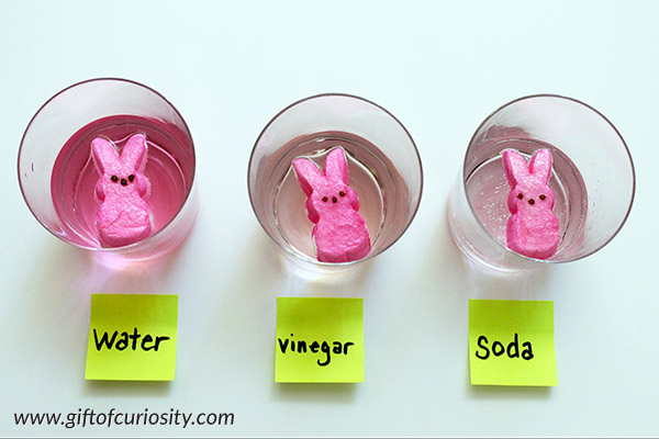 - Make a prediction about what will happen to each of the peeps as they sit in the liquid. Write down the predictions so you can revisit them once the experiment has concluded.