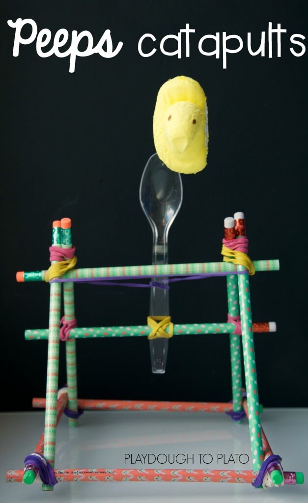 This type of catapult is called a mangonel and it uses tension from a stretched rubber band to hurl the Peeps across the room.